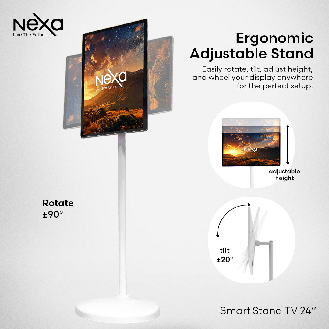 The Nexa Smart Stand TV 24’’ is a versatile Full HD touch display with Android 13, built-in battery, and ergonomic adjustable stand. Packed with smart features, powerful speakers, and app support, it’s perfect for home, office, or retail use.